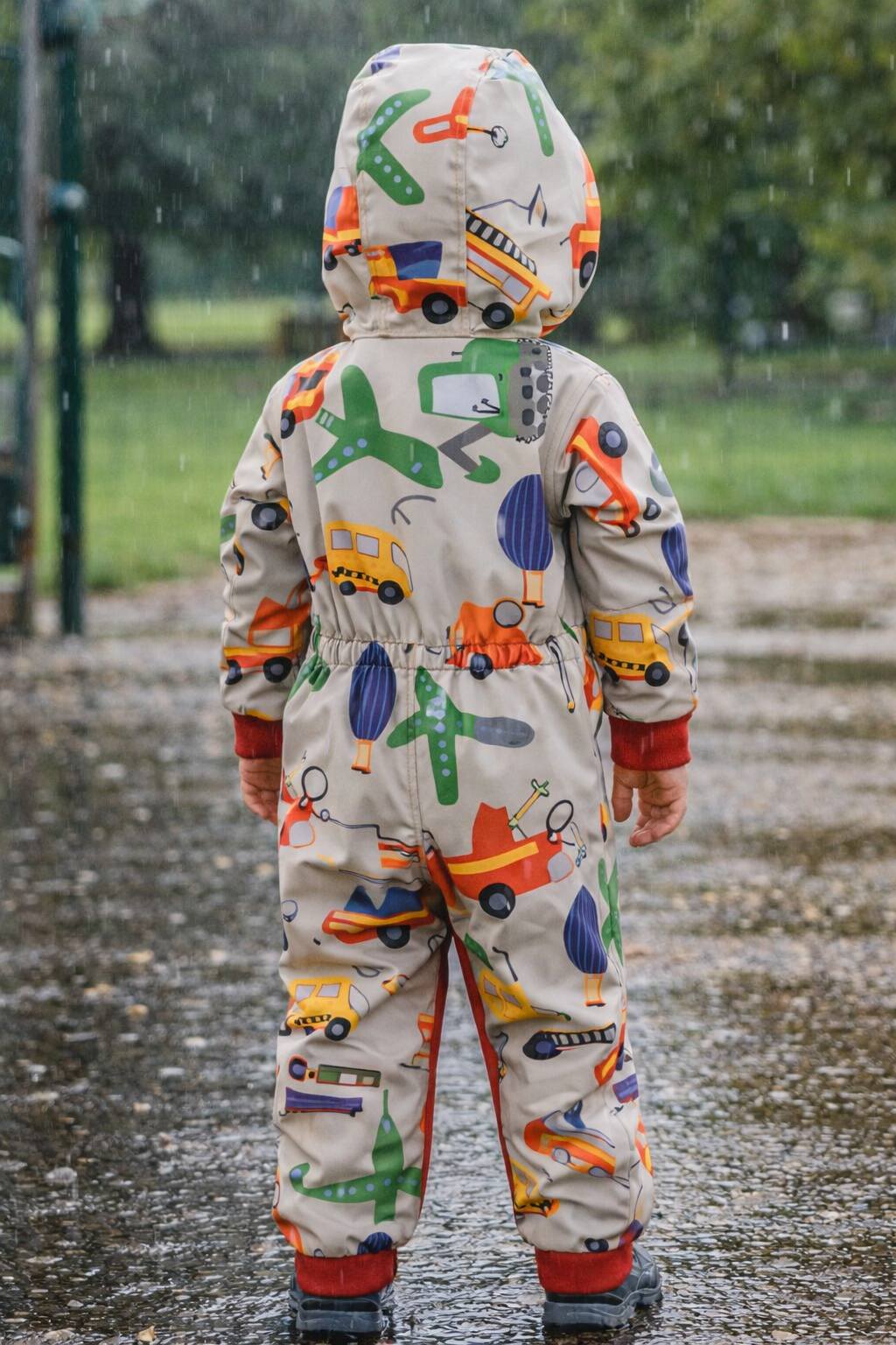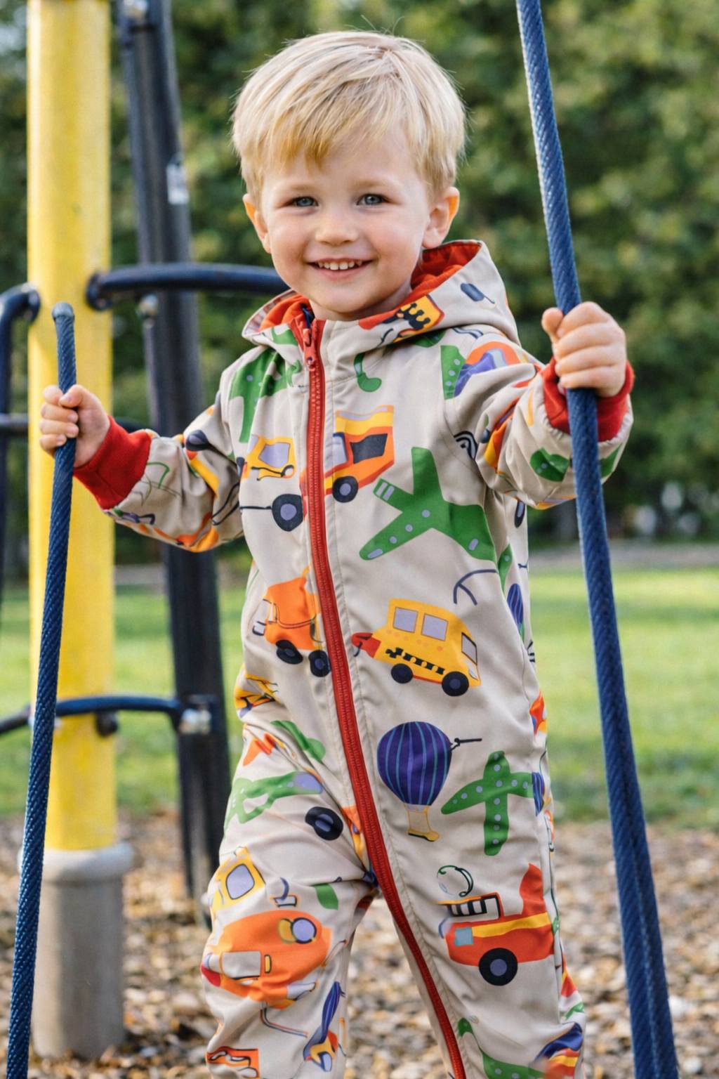 Imprimeu vesel cu mașini, avioane, autobuze și baloane cu aer cald – exact ce adoră băieții (și fetele!) curioși. O salopetă atât de frumoasă, că o vor vrea puse pe ei chiar și pe vreme bună!