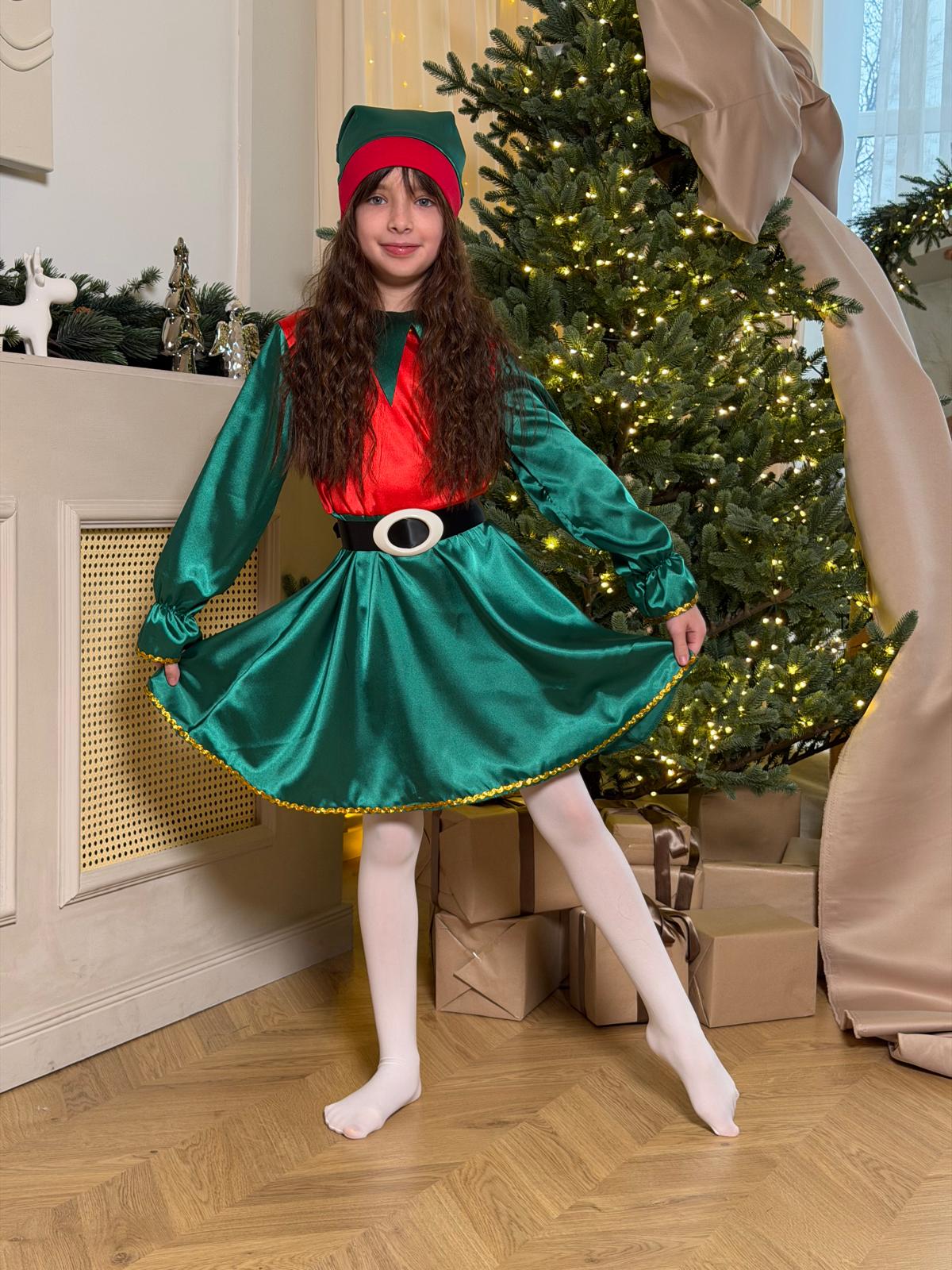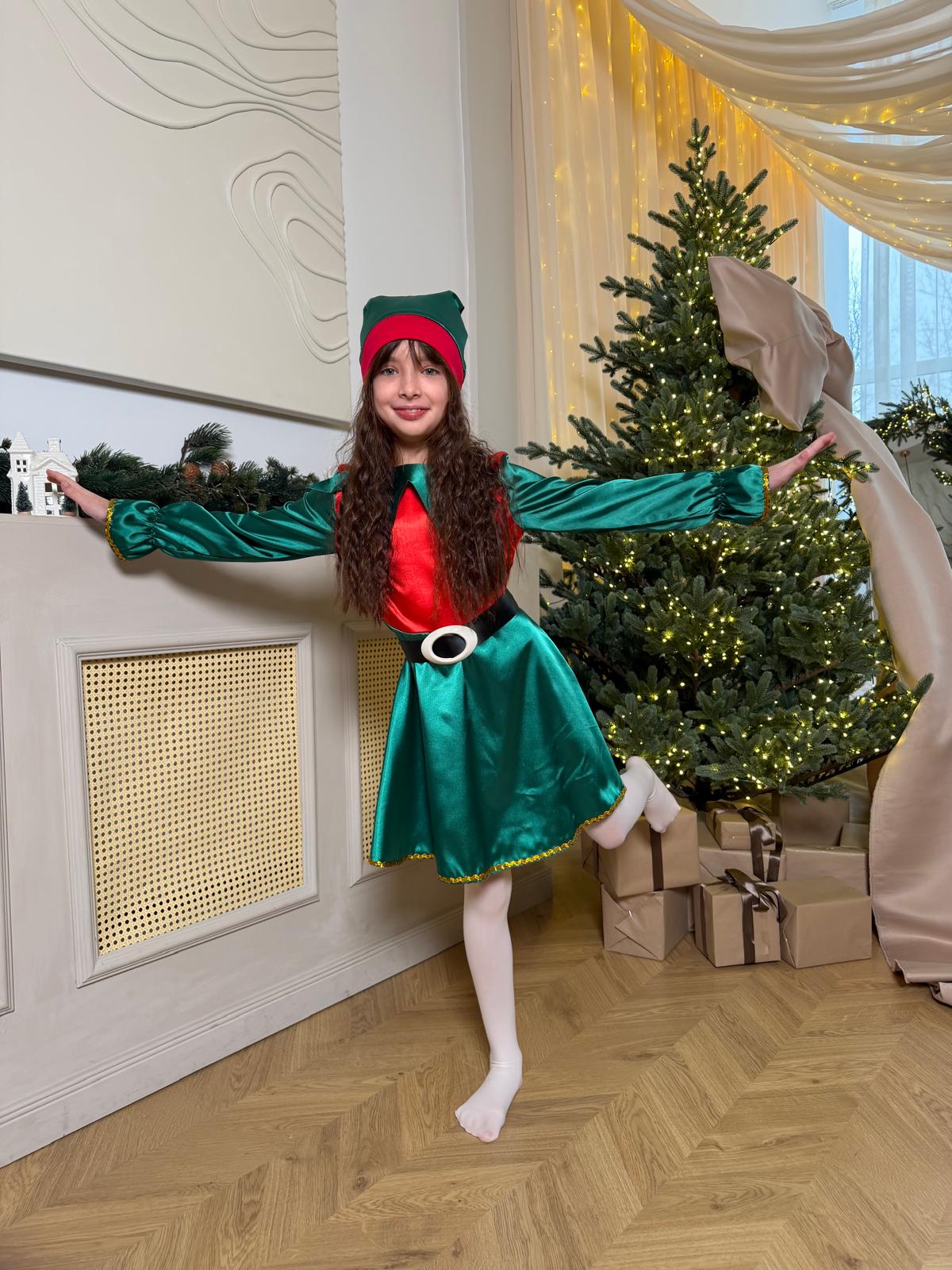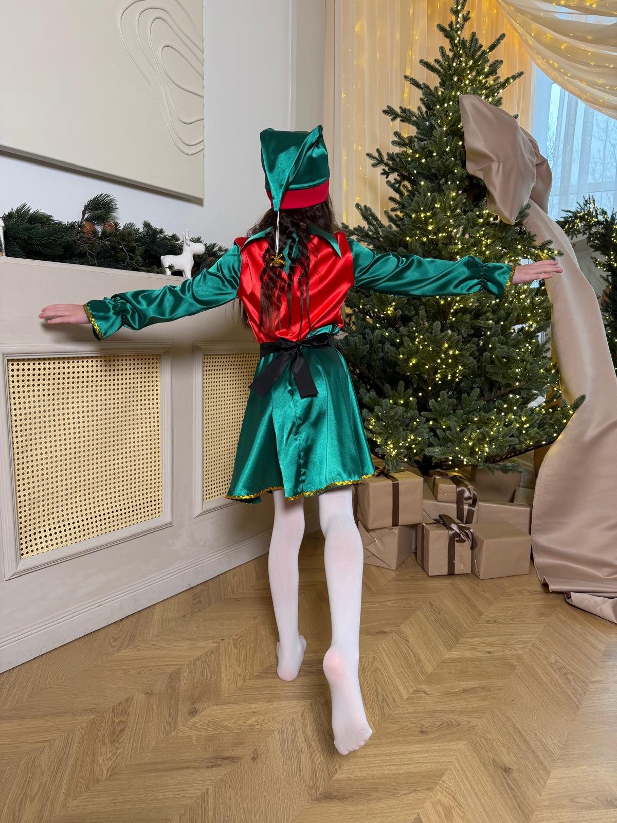 Acest costum de Spiriduș pentru fetițe transformă orice serbare într-un moment plin de culoare și magie. Realizat din saten elastic, cu luciu elegant și textură plăcută, setul este conceput pentru a oferi atât aspect festiv, cât și confort la purtare. Rochia are o croială lejeră și fluidă, unde talia este evidențiată printr-un cordon decorativ cu cataramă, care completează perfect tema de Crăciun.