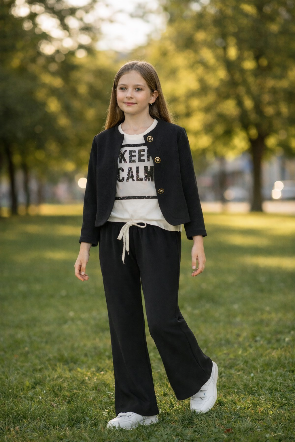 Pantaloni negri pentru fete, cu croială largă modernă, concepuți pentru confort și libertate de mișcare. Un model versatil, ideal pentru sezonul de primăvară și perfect pentru ținutele de zi cu zi sau pentru școală.